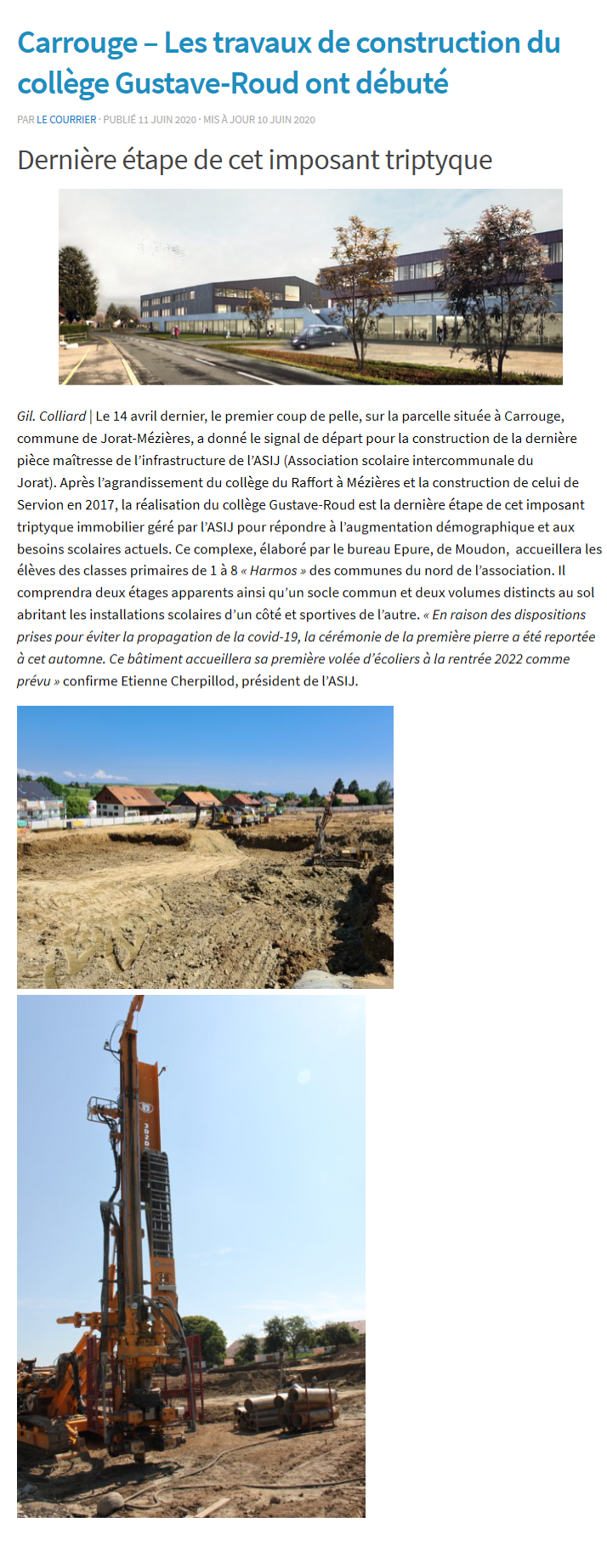Notre bureau d’ingénieurs civils est fier de pouvoir œuvrer sur ce magnifique projet de construction du collège Gustave-Roud à Carrouge. Ce complexe comprendra deux étages ainsi qu’un socle commun et deux volumes abritant les installations scolaires d’un côté et sportives de l’autre. La première rentrée scolaire se fera en 2022.